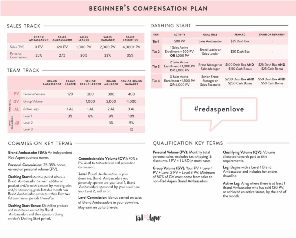 Red Aspen has 2 tracks- a Sales Track and a Team Track. You do not have to build a team to make money with Red Aspen, but you have the option to team build if you want to. Here is a breakdown of the beginner’s commission plan for both tracks.